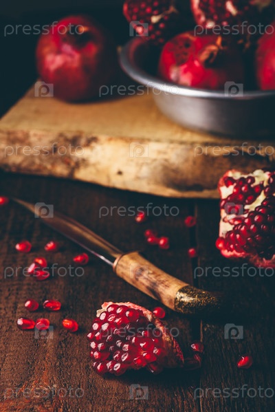 Плоды граната с ножом на деревянном столе