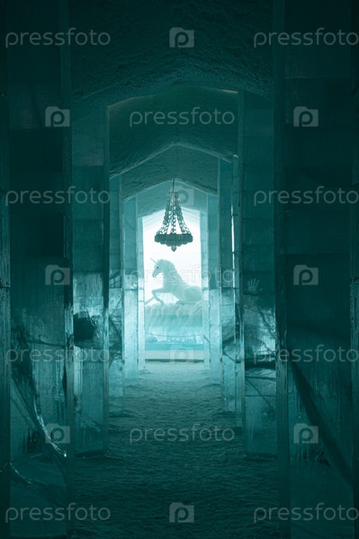 Скульптура единорога в Ледовом отеле Ice Hotel, Юккасьярви, Кируна, Лен Норрботтен, Лапландия, Швеция, Европа