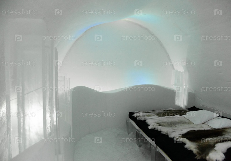Ледяной отель Ice Hotel, ШВЕЦИЯ - МАРТ 2014: Красивый гостиничный номер, индивидуально оформленный и вырезанный вручную художником в Ice Hotel в Юккасярви недалеко от Кируны в Швеции