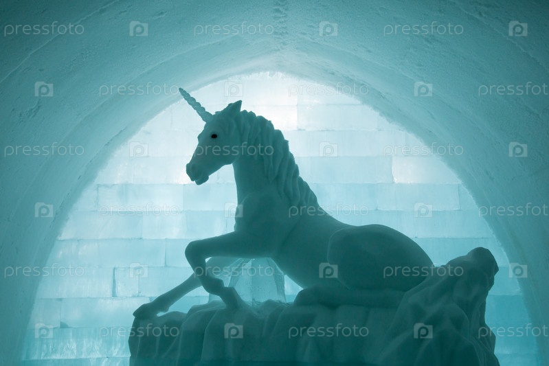 Скульптура единорога в Ледовом отеле Ice Hotel, Юккасьярви, Кируна, Лен Норрботтен, Лапландия, Швеция, Европа