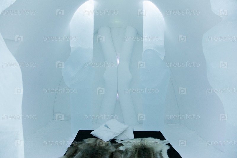 Ледяной отель Ice Hotel, ШВЕЦИЯ - МАРТ 2014: Красивый гостиничный номер, индивидуально оформленный и вырезанный вручную художником в Ice Hotel в Юккасярви недалеко от Кируны в Швеции