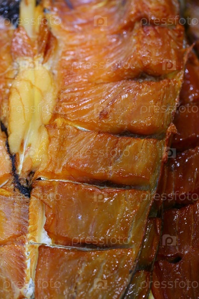 Копченый морской окунь на прилавке на ярмарке