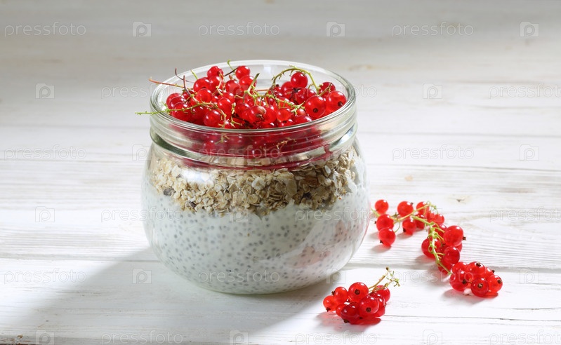 Десерт из творога с чиа, клубникой и смородиной на белом фоне