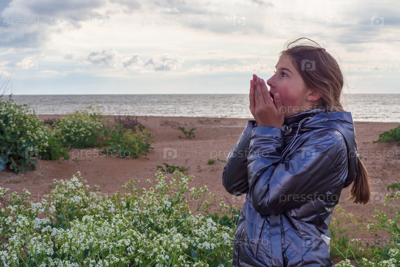 Девушка в сером жакете от удивления прикрывает рот ладонями, стоя в полевых цветах на фоне природы с морским пейзажем. Тенденция местных путешествий. Семейная прогулка путешественников