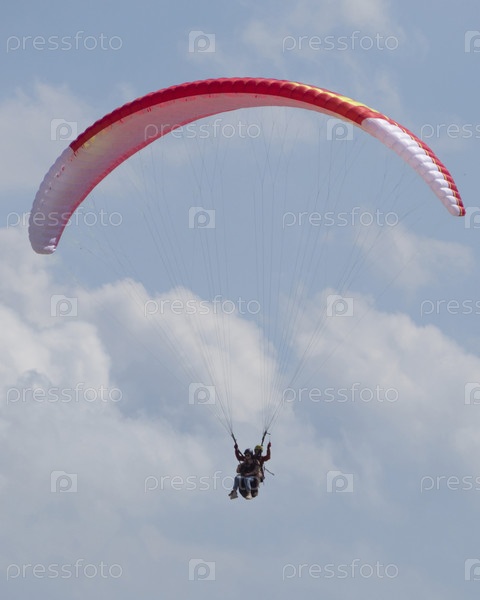 Параглайдинг в тандеме. Спортсмен-парапланерист с девушкой на бело-красном параплане летят на фоне голубого неба с легкими белыми облаками. Россия Краснодар Камышеватская 14.06.2021