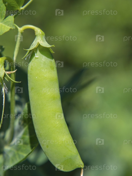 Крупный план стручка зеленого гороха на ветке горохового растения при естественном освещении на размытом зеленом фоне грядки. Натуральная органическая пища