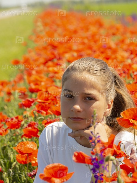 Красивая милая девушка сидит на размытом цветочном поле, освещенном солнцем. Портрет девочки-подростка, смотрящей в камеру. Несфокусированные красные маки