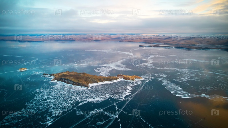 Аэрофотосъемка озера Байкал зимой. Прекрасный вид на замерзшее озеро, чистый лед, остров Олтрек