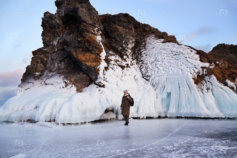 Остров Ольтрек зимой. На скалах лежит снег и большие сосульки. Женщина путешествует по замерзшему озеру Байкал