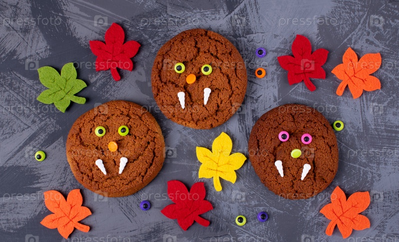Печенье-монстр на Хэллоуин, украшенное сахарными глазами и клыками, окруженное игрушечными осенними листьями. Вид сверху. Праздничное лакомство для детей
