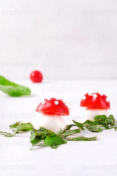 Закуска, напоминающая мухомор из моцареллы и половинки помидоров черри на белом столе. Детская праздничная еда или закуска на Хэллоуин. Креативный вариант подачи капрезе