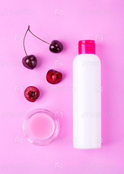 Гель для душа с вишней на розовом. Немаркированный продукт по уходу за телом с натуральными ингредиентами. Плоская планировка