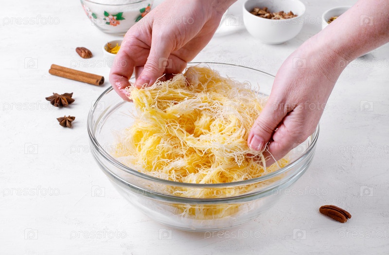 Замешиваем тесто катаифи с растопленным сливочным маслом. Приготовление десерта кунафа. Египетская кухня