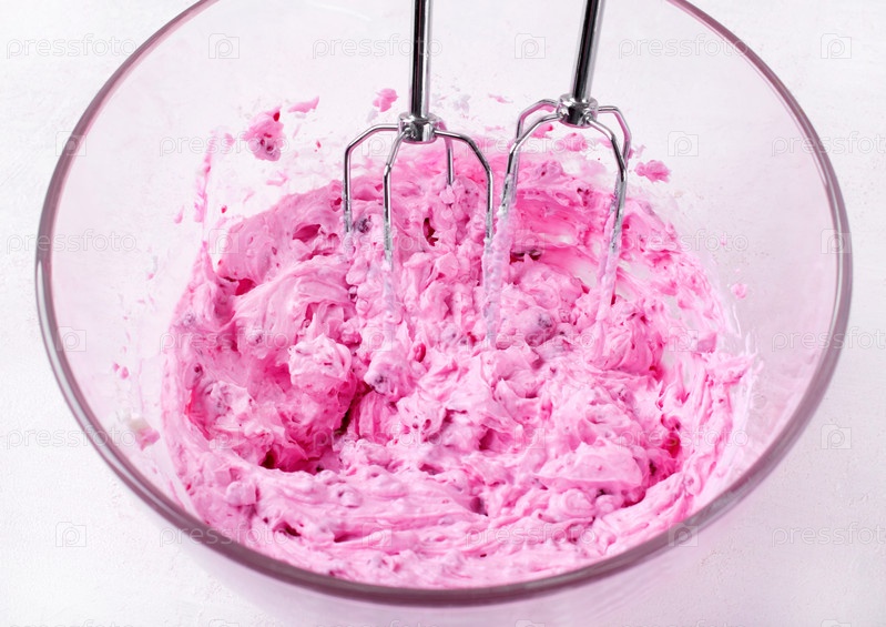 Ягодный крем, взбитый миксером в стеклянной посуде. Ингредиент для приготовления десерта