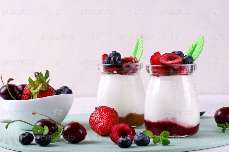 Десерт из взбитого творога с джемом в банке, увенчанный ягодами. Здоровый завтрак