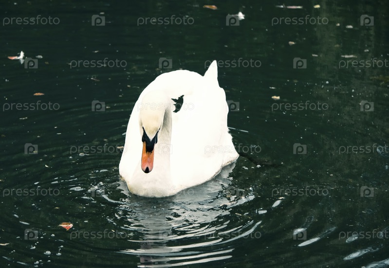 Белый лебедь на темном фоне озера