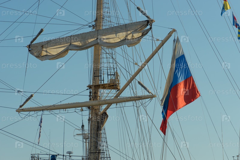 Мачта парусника и российский флаг на фоне голубого неба