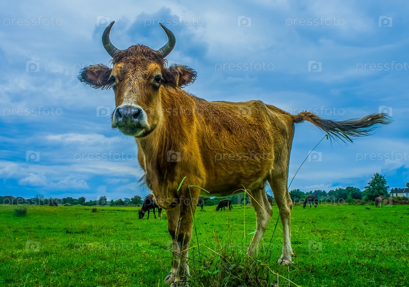 Портрет рыжей коровы на фоне зеленой травы