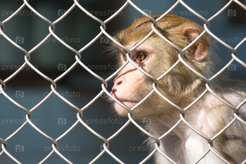 Портрет маленькой обезьянки, сидящей в клетке в питомнике обезьян. Сухуми, Абхазия, Грузия, 1 апреля 2014 г