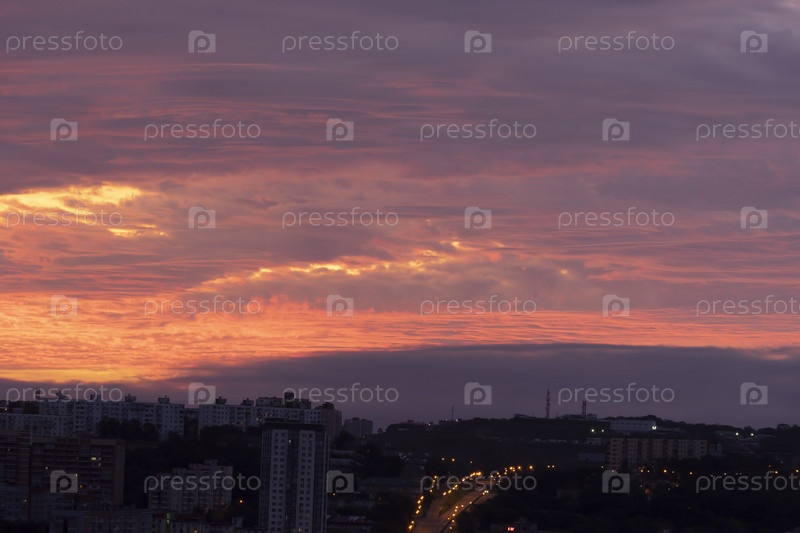 Красивый восход солнца над городским пейзажем. Владивосток