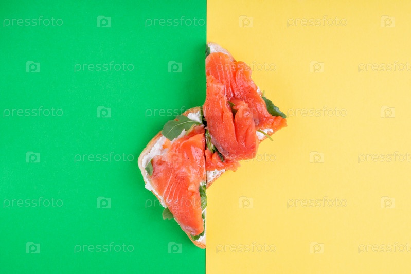 Тост с соленой форелью, сливочным сыром и рукколой, разрезанной на две части на желто-зеленом геометрическом фоне. Креативная презентация. Копировать пространство