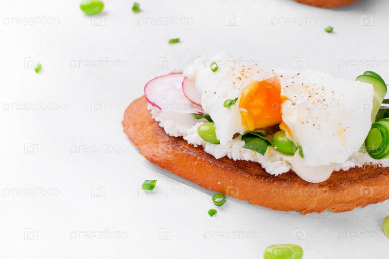 Яйцо-пашот на тосте со сливочным сыром, редисом, огурцом и фасолью эдамаме на белом столе. Сэндвич на завтрак
