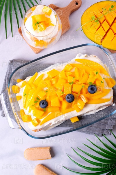 Торт тирамису с манго, увенчанный кусочками фруктов, подается в стеклянной посуде. Вариация итальянского десерта. Вид сверху