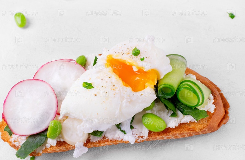 Яйцо-пашот на тосте со сливочным сыром, редисом, огурцом и фасолью эдамаме на белом столе. Сэндвич на завтрак