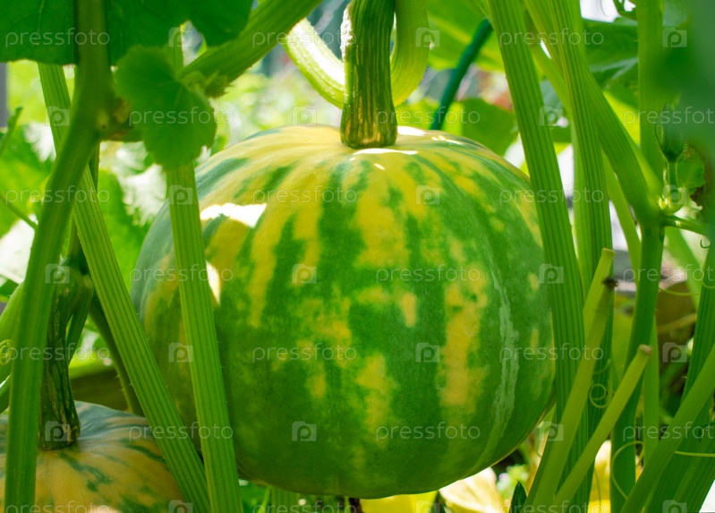 Тыква растет на грядке на открытом воздухе. Домашняя продукция