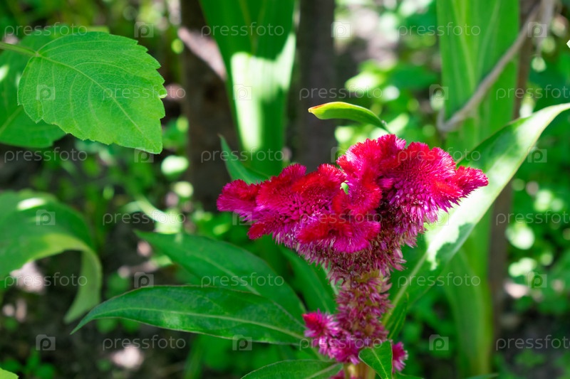 Красный цветок целозии (петушиный гребешок) растет в саду. Необычное цветущее растение