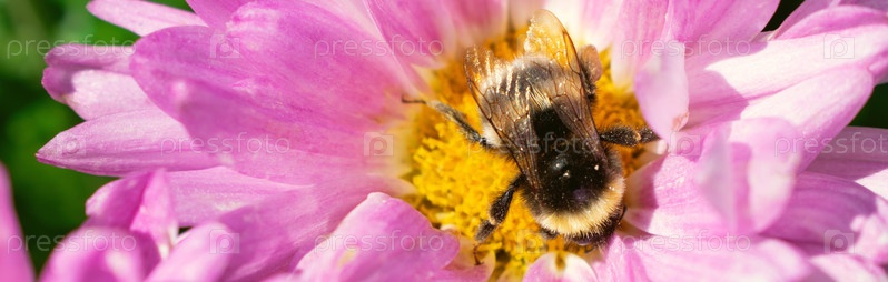 Шмель собирает пыльцу с розового цветка хризантемы в солнечный день. Веб-баннер