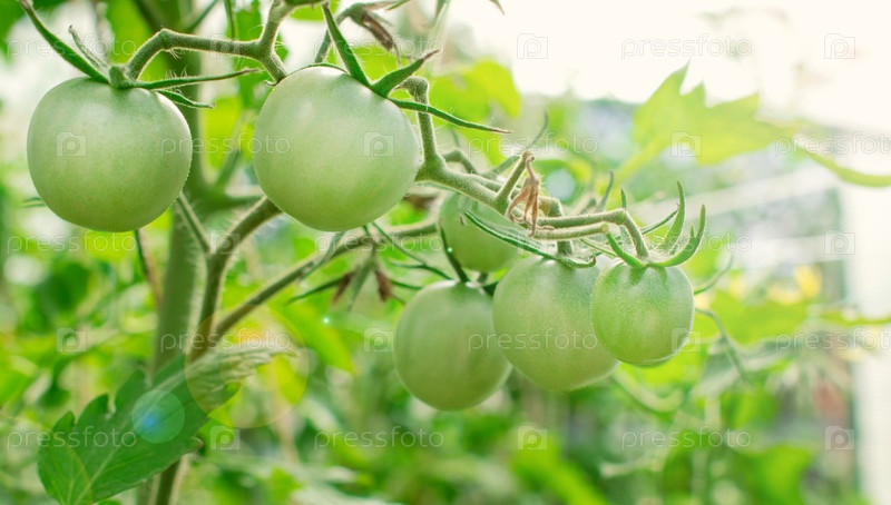 Зеленые помидоры растут в теплице. Домашняя продукция