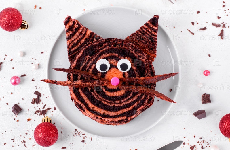 Торт с тигром на керамической тарелке на белом столе. Детская еда. Десерт на китайский Новый год 2022. Вид сверху