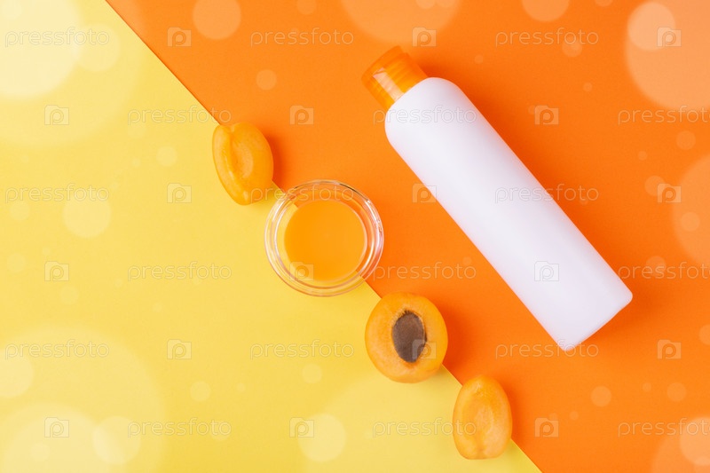Гель для душа с абрикосом на оранжевом и желтом. Немаркированный продукт по уходу за телом или моющее средство с фруктовым ароматом. Копировать пространство
