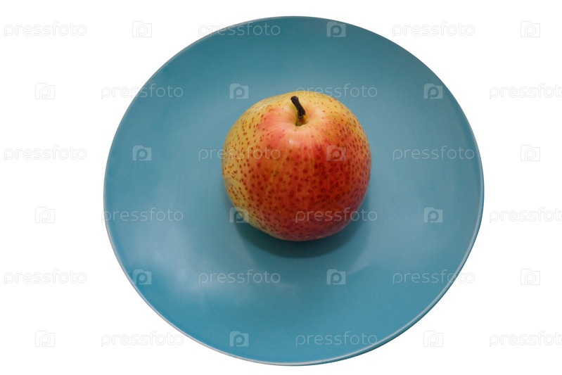 Сочная груша на синей керамической тарелке изолировать на белом фоне