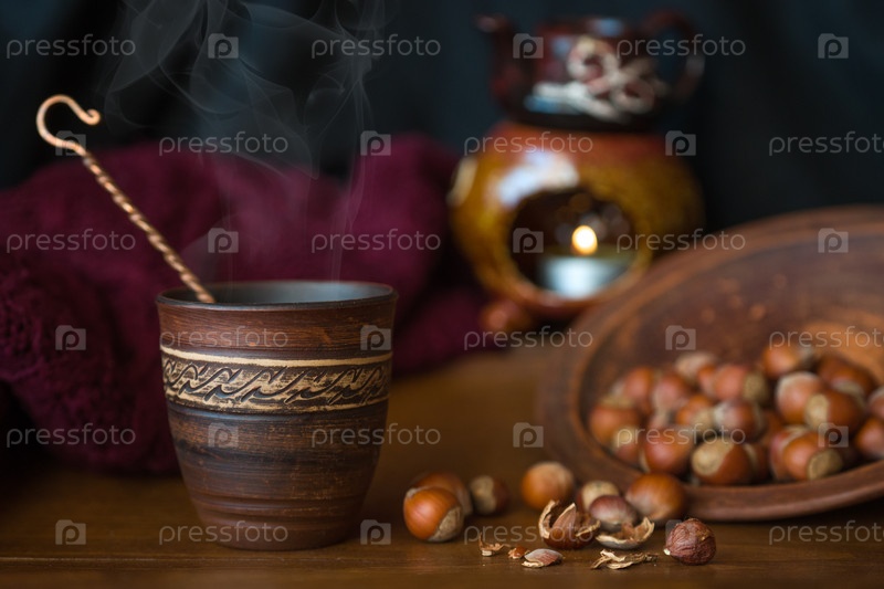 Темный фон с горячим напитком в керамической чашке и разбросанными орехами фундука на деревянной поверхности