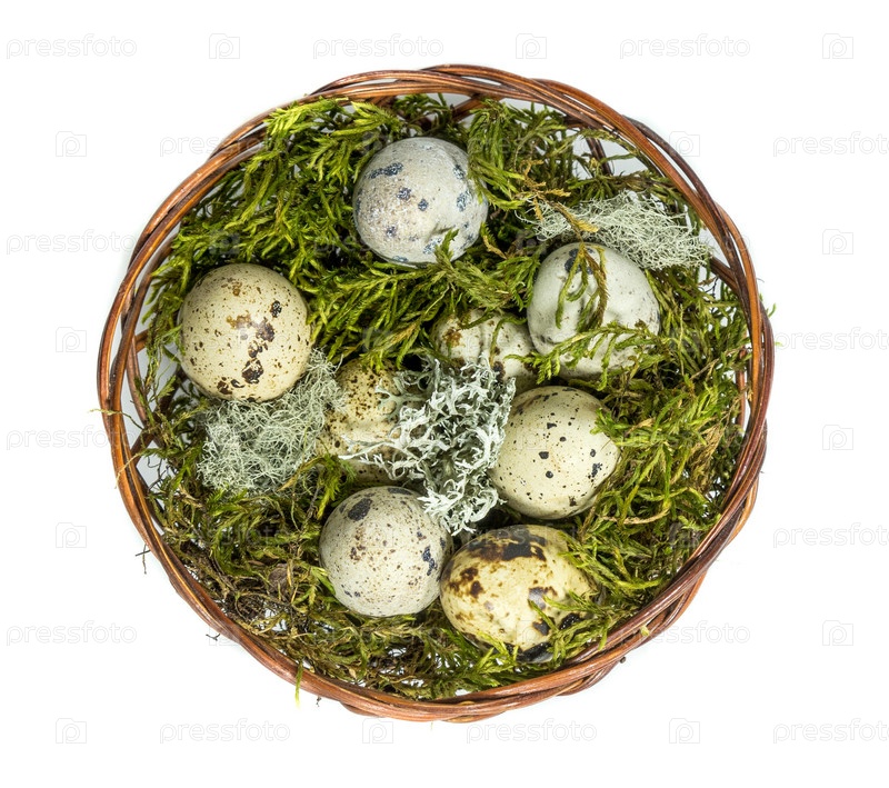 Плетеная корзина лежит в зеленом мху, перепелиные яйца на светлом фоне