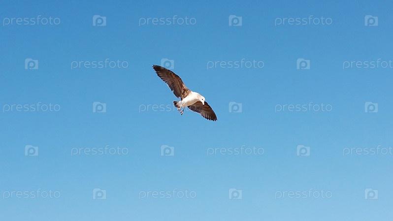 Чайка летит над головой в голубом небе