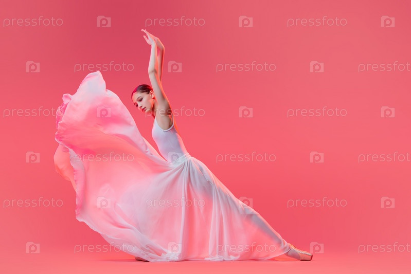 Элегантная балерина в пуантах танцует в длинной белой юбке на розовом фоне