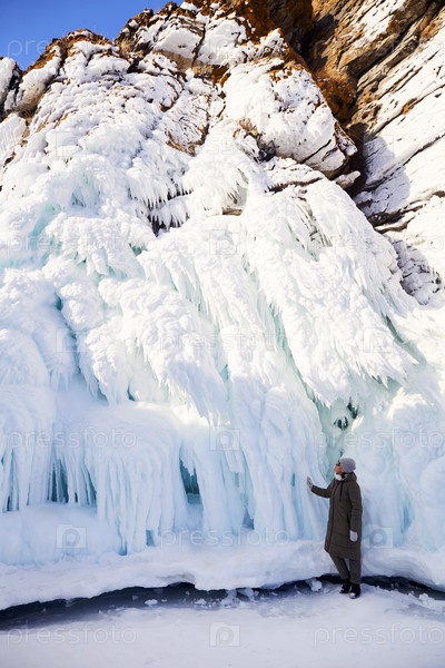 Женщина смотрит на огромные сосульки на скалах
