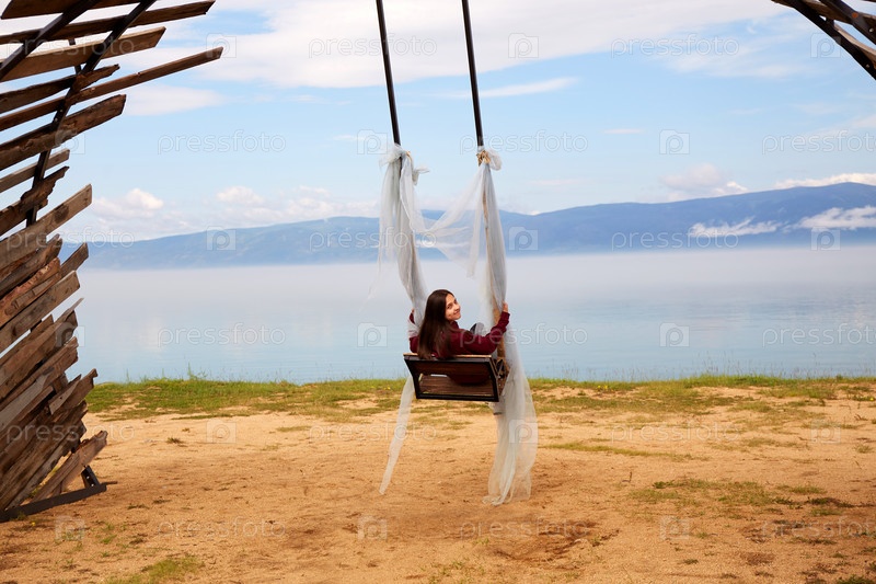 Молодая счастливая девушка сидит на деревянных качелях с видом на озеро Байкал. Красивый летний пейзаж