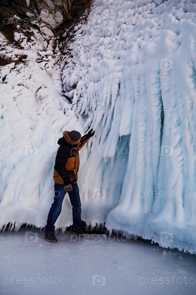 Мужчина любуется огромными сосульками на скалах. Зимнее путешествие по замерзшему Байкалу