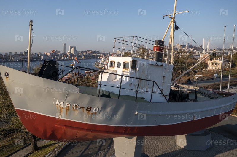 Владивосток, Россия - 24 октября 2021 г.: Городской пейзаж с видом на памятник морякам в виде катера