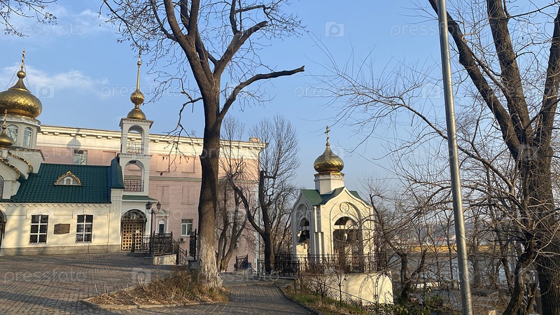 Владивосток, Россия - 18 ноября 2021 г.: Городской пейзаж с видом на Свято-Успенский храм