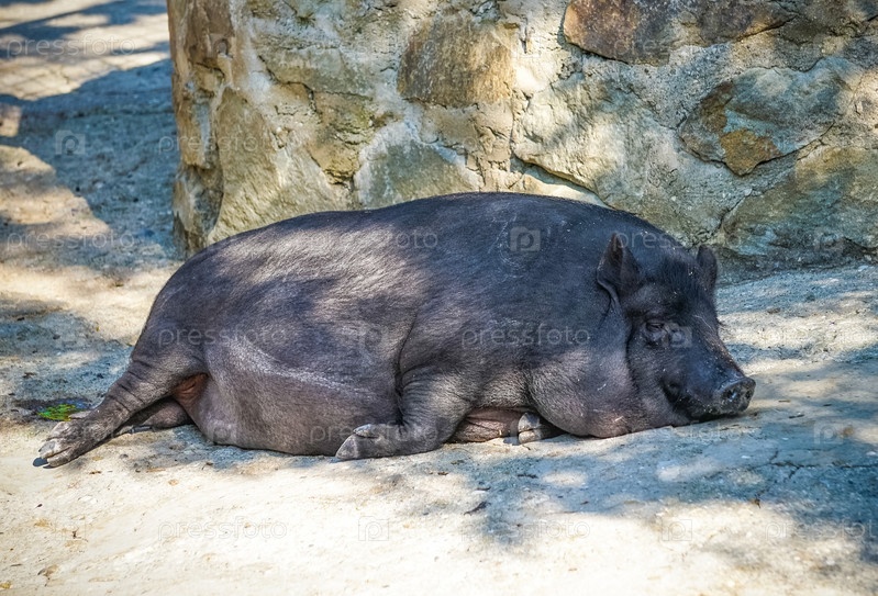 Портрет свиньи, спящей на земле в солнечный день