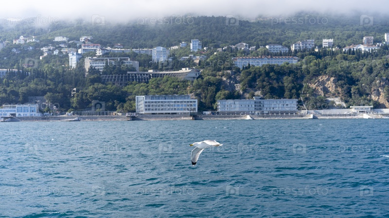 Морской пейзаж с летящей чайкой на фоне береговой линии. Ялта, Крым