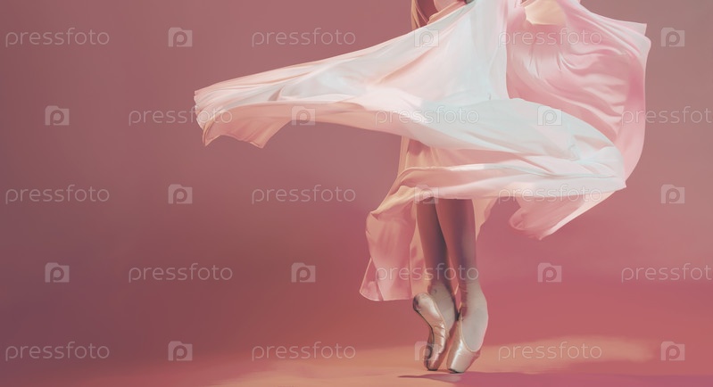 Ноги балерины в пуантах в окружении развевающейся юбки стоят на бежевом фоне