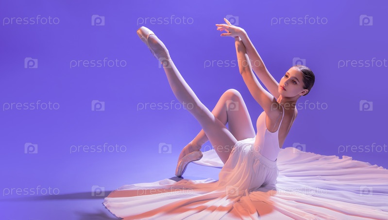Элегантная балерина в пуантах сидит, вытянув ноги в длинной белой юбке на сиреневом светлом фоне