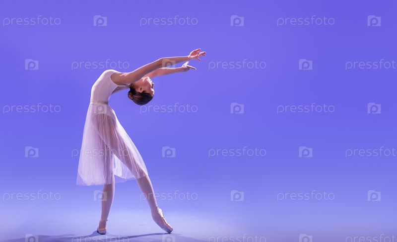 Элегантная балерина в пуантах танцует в длинной развевающейся белой юбке на сиреневом светлом фоне