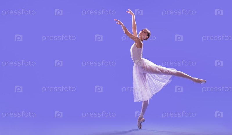 Элегантная балерина в пуантах танцует в длинной развевающейся белой юбке на сиреневом светлом фоне